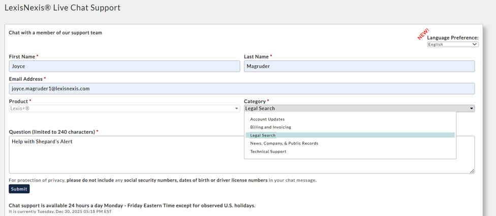 Live Chat Support on Lexis+ and Lexis+ AI provides a dynamic, interactive way to address legal research, news and company searching, and technical support. With 24/7 real-time assistance, you can connect instantly with experts who are ready to help.