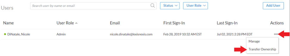 Then you scroll down to where the users are all listed. Find the name of the individual whose content you want to transfer (there is a search box there to help with that), click on the three dots at the far right, and then select the Transfer Ownership option.