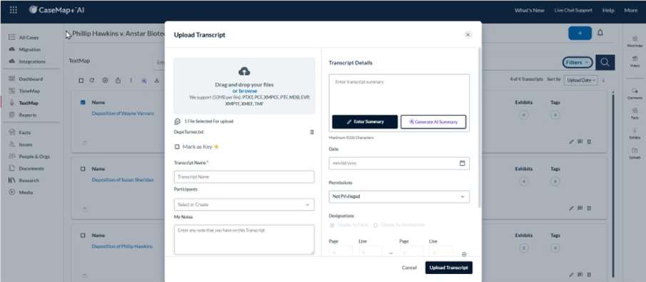 - A new TextMap® enhancement was commercially launched on Monday, November 3rd, as an integral part of the CaseMap+ AI platform. This update introduces an improved transcript upload process that features streamlined drag & drop functionality alongside metadata entry within a single, user-friendly modal. The enhancement ensures a consistent and unified experience across both TextMap and Documents. This update streamlines transcript management and enhances case organization by aligning TextMap with the overall design of CaseMap+ AI. Users can now upload transcripts more quickly, record essential contextual details through metadata input, and access AI-generated summaries with ease. This improvement is part of our ongoing efforts to provide a seamless, AI-driven case analysis experience across the CaseMap+ AI platform.