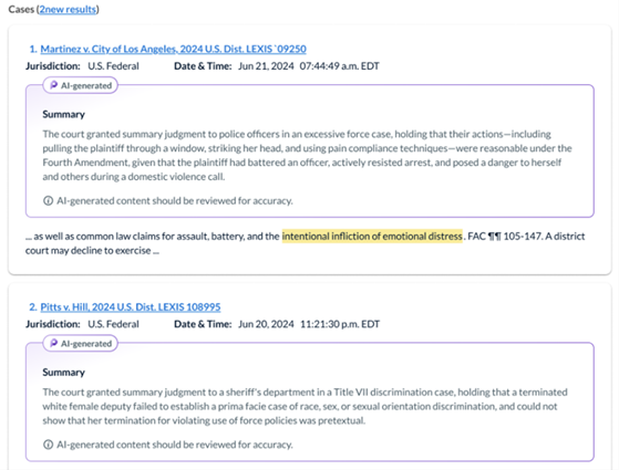 With this enhancement, researchers receiving caselaw alerts will now see concise, AI-generated summaries of new caselaw results meeting their alert criteria – both in email notifications and on the alerts results page: