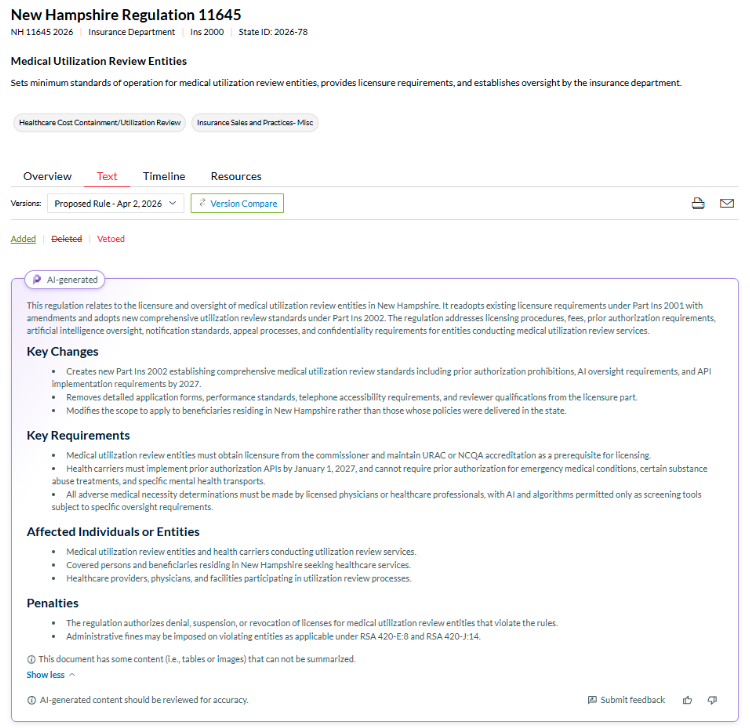 LexisNexis State Net has introduced a solution that fundamentally changes this equation: AI-generated summaries that appear at the top of bills and regulations. These summaries provide key requirements, targeted entities and penalties for most versions of legislative and regulatory text, including proposed rules, adopted rules, final rules and emergency rules.