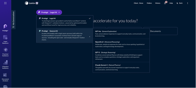 We recently launched Protégé™ General AI in our award-winning Lexis+ AI solution, which allows users to select the underlying large language model (LLM) to power LexisNexis Protégé, the personalized AI assistant. This new functionality is purpose-built for legal professionals and was designed for the multi-faceted nature of how lawyers work today.