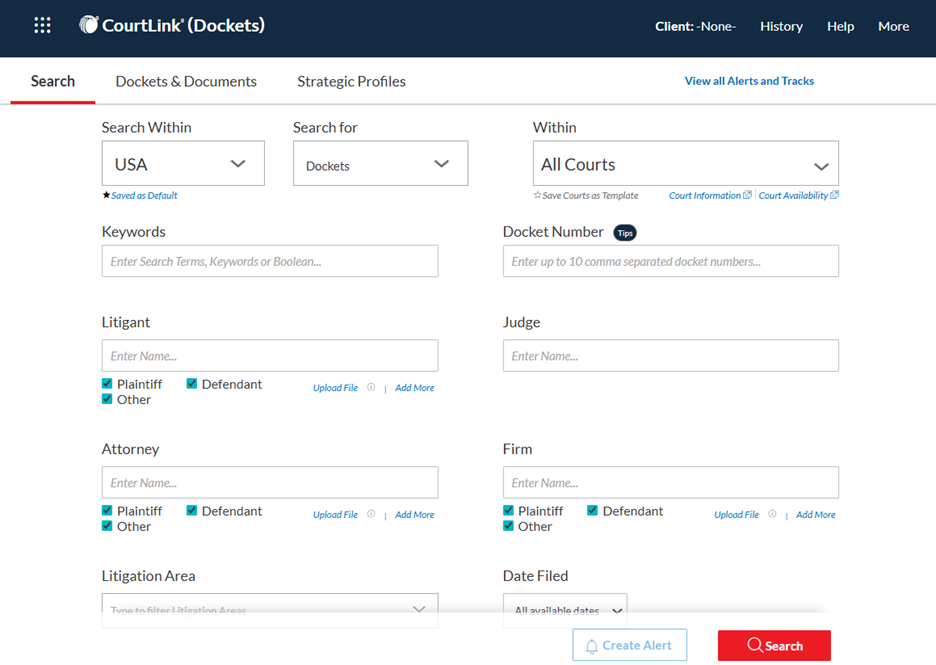CourtLink give you the fastest and most comprehensive view of new litigation in the United States. With coverage of more than 1,900 state and federal courts, powerful search tools, and customizable alerts, CourtLink ensures you never miss a new filing involving your clients, competitors, or target industries.