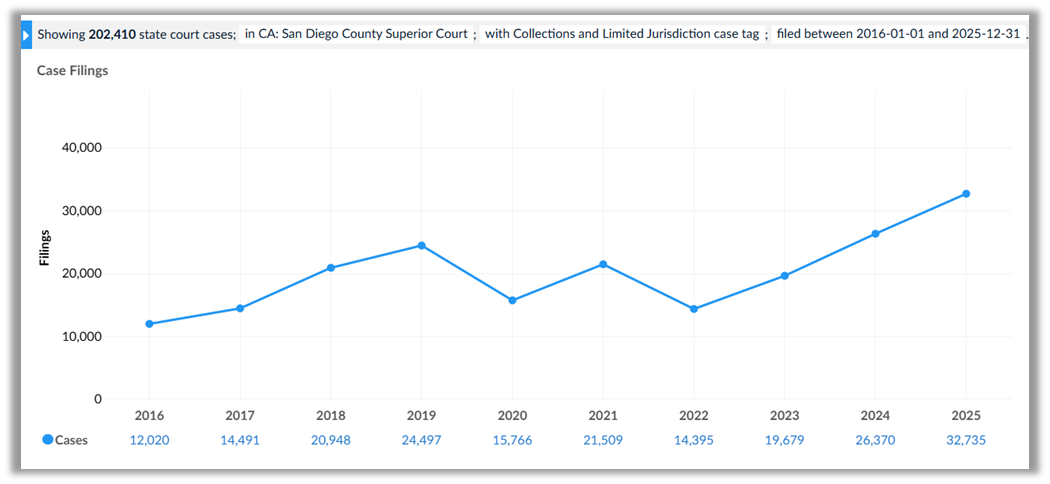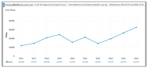 New insights from Lex Machina®, the LexisNexis® Legal Analytics® platform, reveal a significant shift in San Diego Superior Court’s civil litigation landscape. While overall civil filings have risen since 2022, the increase is almost entirely attributable to a sharp uptick in limited-jurisdiction collections lawsuits, in which creditors or debt-purchasers pursue recovery of alleged debt under $35,000. In 2025, creditors filed more than 32,000 such cases, an increase of more than 65 percent compared to total filings in 2023.