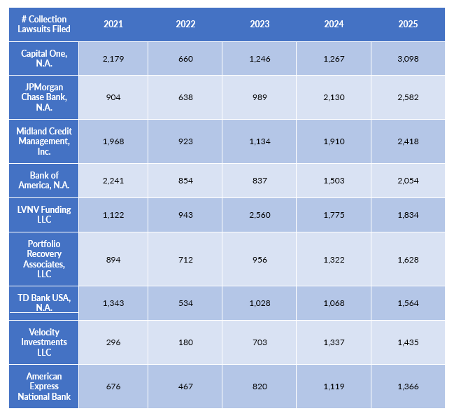 Data from Lex Machina shows that only a handful of creditors and debt purchasers are responsible for most of the recent surge in lawsuits. Capital One, JPMorgan Chase Bank, Portfolio Recovery Associates, American Express National Bank, and Velocity Investments all recorded substantial year-over-year increases in San Diego filings. From 2023 to 2025, several more than doubled their recent historical averages.