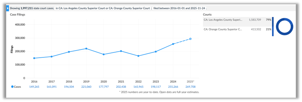 Litigators have had their hands full in and around Los Angeles. According to data from Lex Machina, the LexisNexis Legal Analytics platform, 2024 saw a significant jump in civil filings across both state and federal courts in the region. The Superior Courts for Los Angeles and Orange Counties each recorded more new civil lawsuits in 2024 than in any year since at least 2016 — and possibly ever. A similar trend played out at the U.S. District Court for the Central District of California, which logged more new civil cases in 2024 than in any year since at least 2009, marking a potential all-time high.