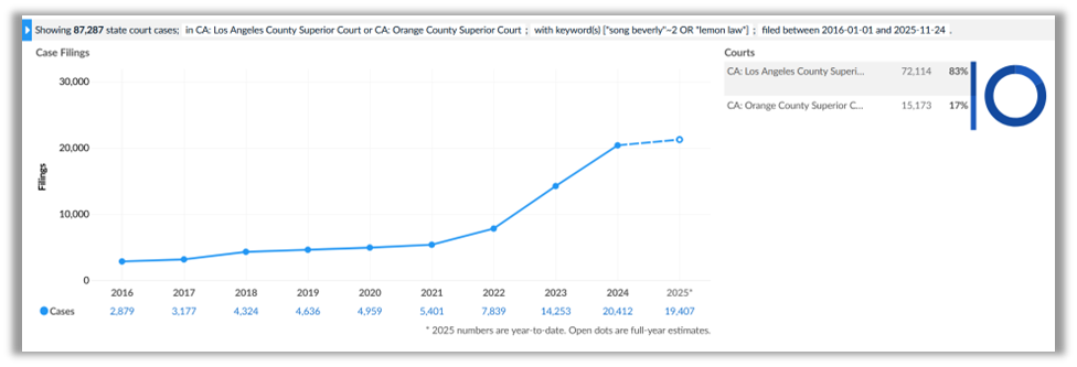 Since 2021, Song-Beverly litigation has surged in Los Angeles and Orange Counties. Plaintiffs filed more than 17,000 lemon law claims there in 2024, a greater than threefold increase from 2021.