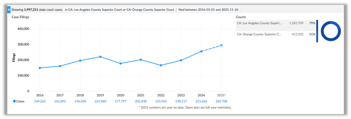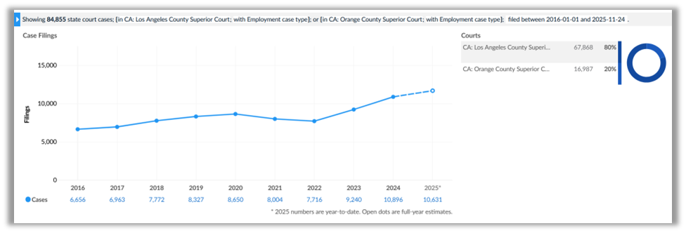 In the Los Angeles County Superior Court alone in 2024, plaintiffs filed more than 8,600 employment-law actions. That was a year-over-year increase of over 17% and the highest annual total since at least 2016. Plaintiffs also filed record numbers of employment lawsuits in 2024 in the Superior Court of Orange County.