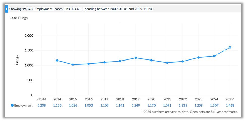 Similarly, in the United States District Court for the Central District of California, more labor and employment lawsuits launched in 2024 than any year since at least 2009. What’s more, as of late 2025, filings in both courts are on track to break these records again.