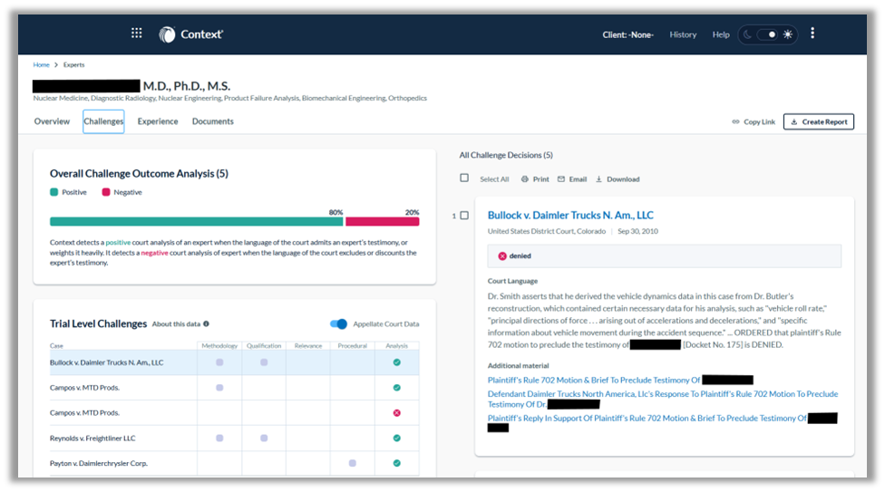 A particularly valuable application for Context lies in expert witness analysis. Using Context, legal professionals can confidently select the right witnesses for their cases by searching and comparing hundreds of thousands of experts based on their area of expertise and testimonial experience. For each expert, legal professionals can discover their most discussed facts and subjects as well as the outcomes of challenges against their testimony. This helps you choose the best experts for your cases and cross-examine adversarial witnesses more effectively.