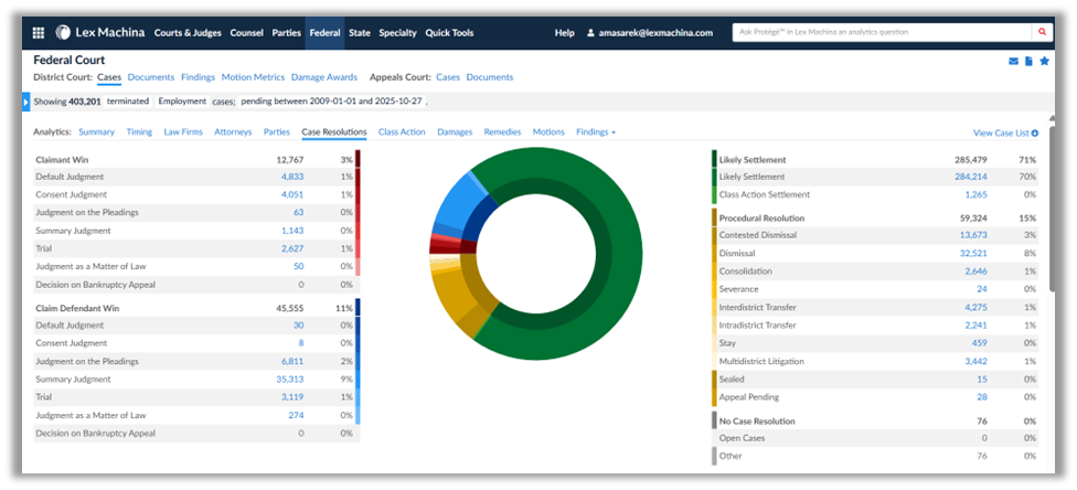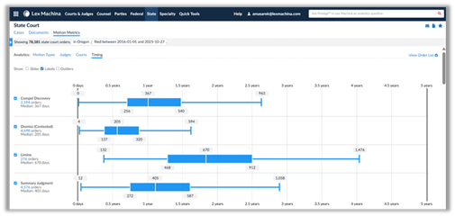 Lex Machina extends analytical insights into the broader litigation lifecycle. Designed to illuminate the entire civil litigation landscape, the premier Legal Analytics platform transforms raw court data into strategic intelligence. In addition to insights from motion outcomes, litigators can analyze case outcomes to estimate liability risk and exposure to damages. That helps clients make informed decisions about whether to compromise or go to trial. During settlement negotiations, legal and insurance professionals can bring data-backed insights to the table, demonstrating how similar cases have resolved and what damages were awarded.
