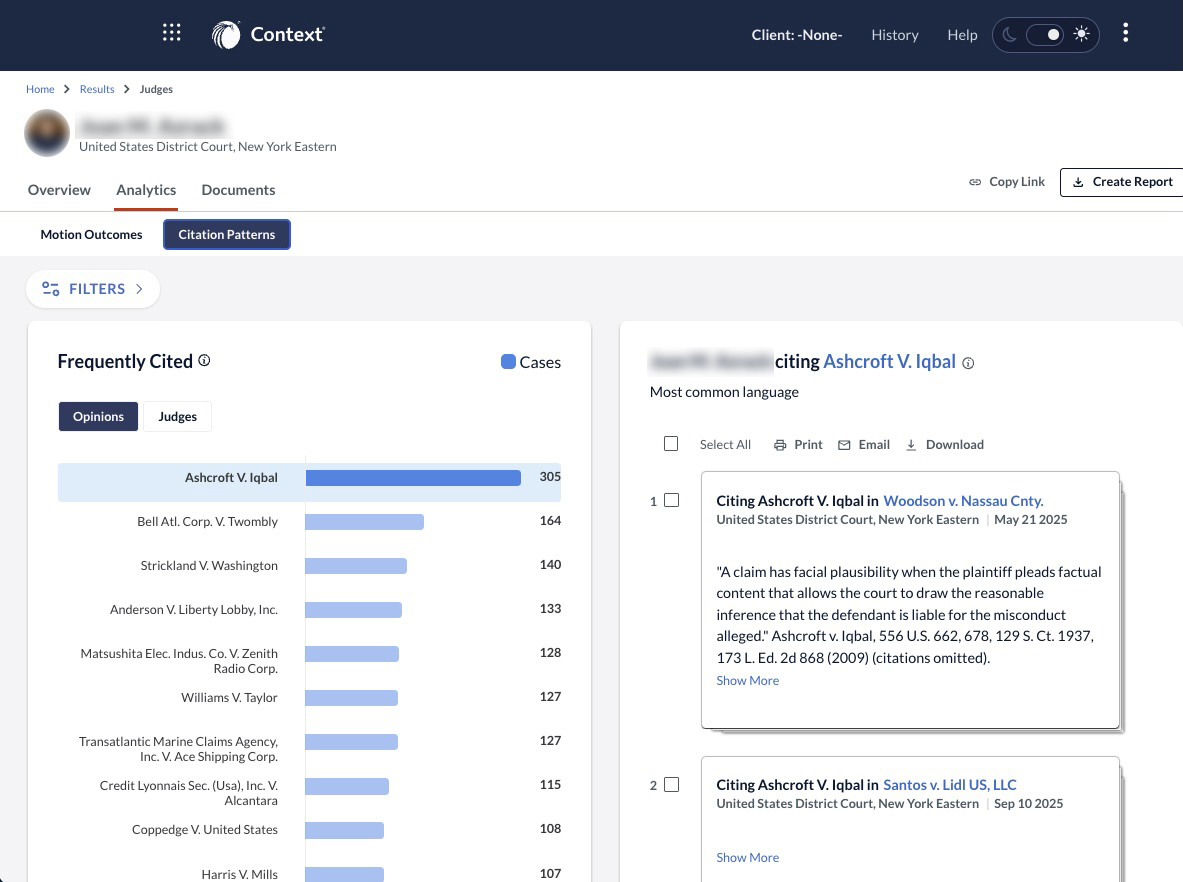 Context provides unparalleled linguistic and behavioral analytics drawn directly from court language, revealing how judges think, how they have ruled on similar arguments, and which reasoning they tend to find persuasive. By surfacing motion outcomes across more than 100 motion types and mapping how judicial language evolves over time, Context helps attorneys frame their arguments with precision and confidence.