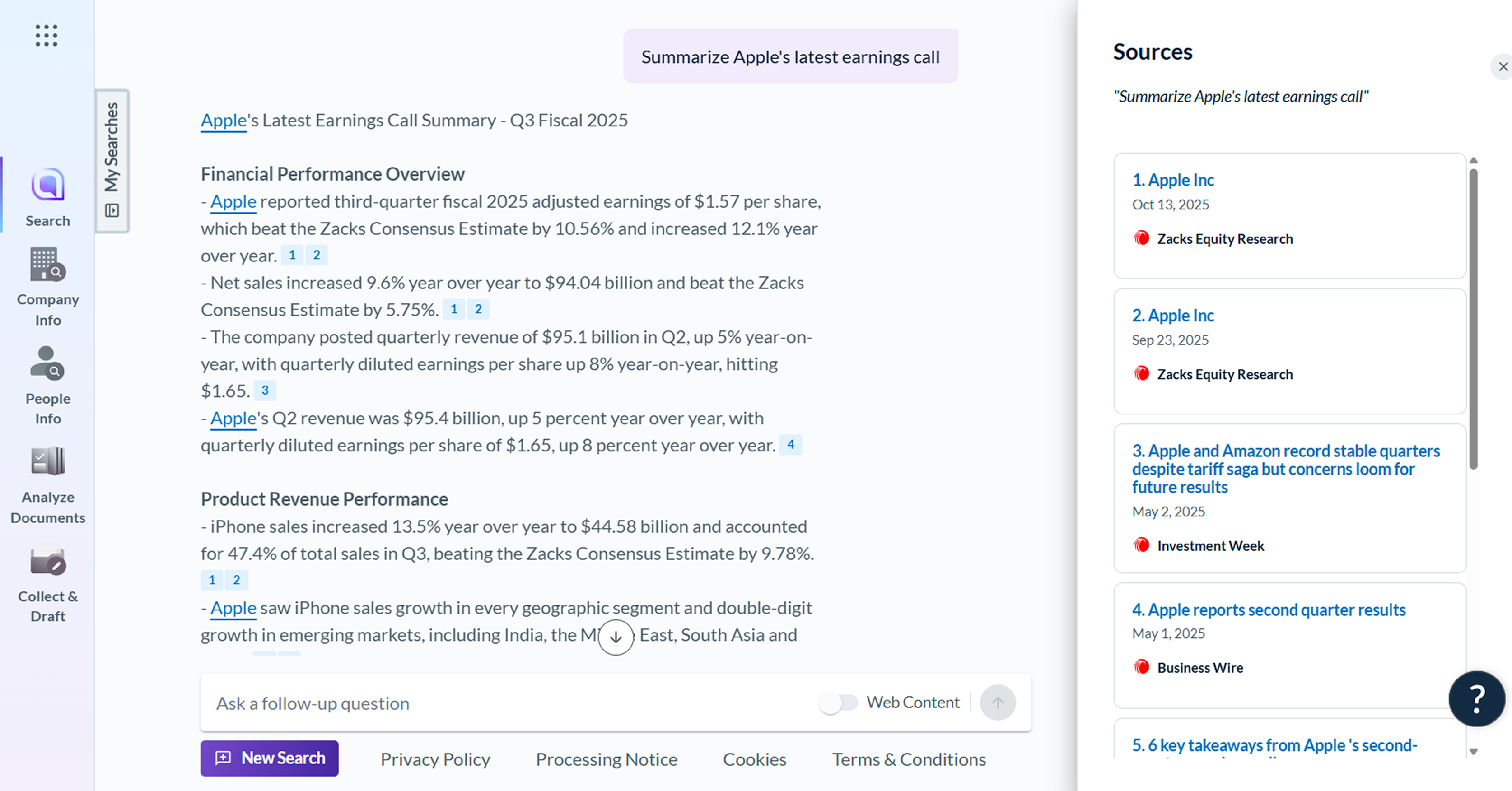 Kickstart your research into news and company and financial data by generating cited, multi-source answers to your research questions.