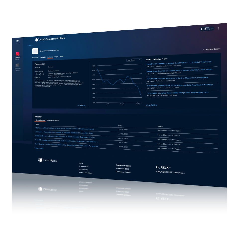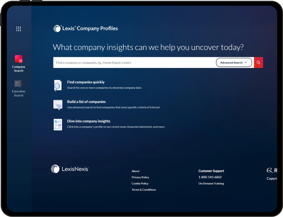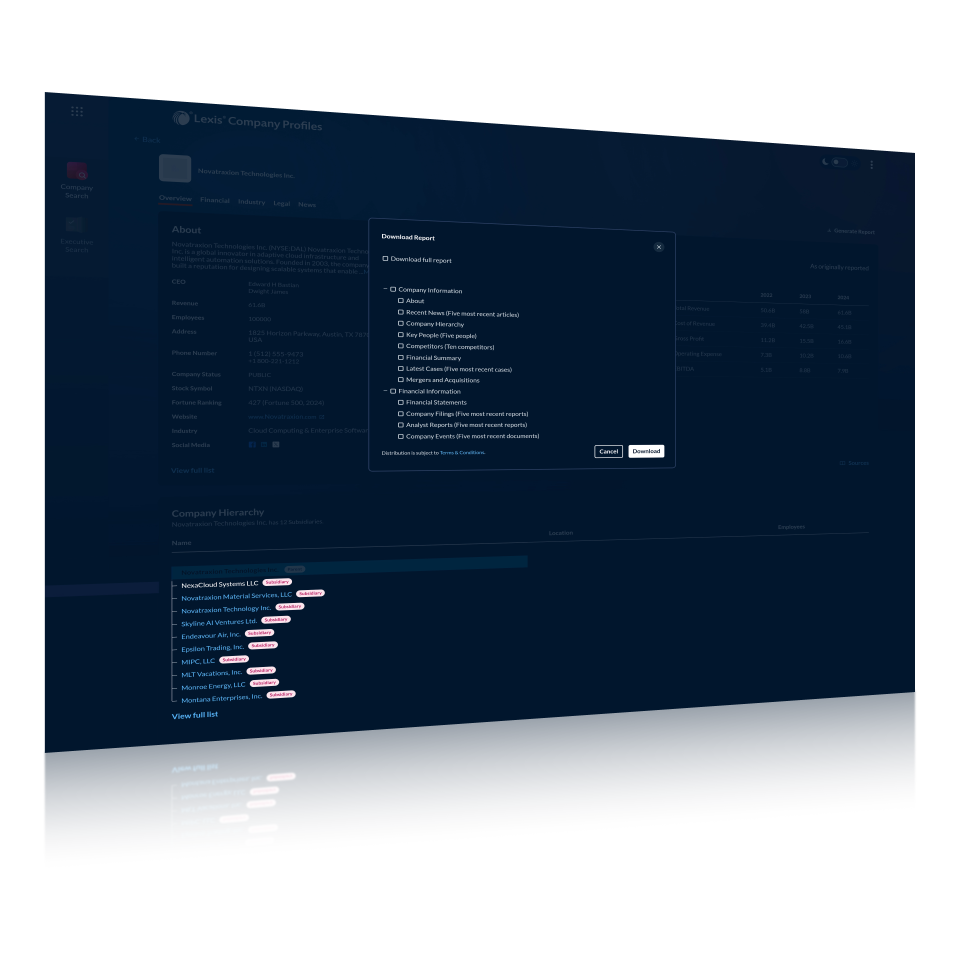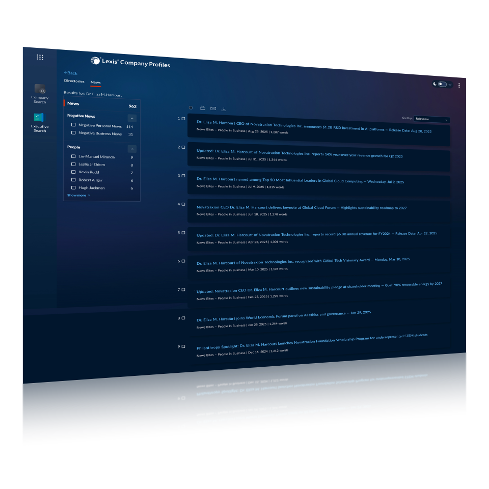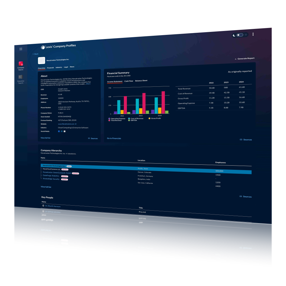Access an expansive and reliable view of any company — executive contacts, corporate hierarchies, financials, SEC filings, litigation history, M&A activity, industry classification, and more — all in one centralized, intuitive platform built for legal and business professionals.