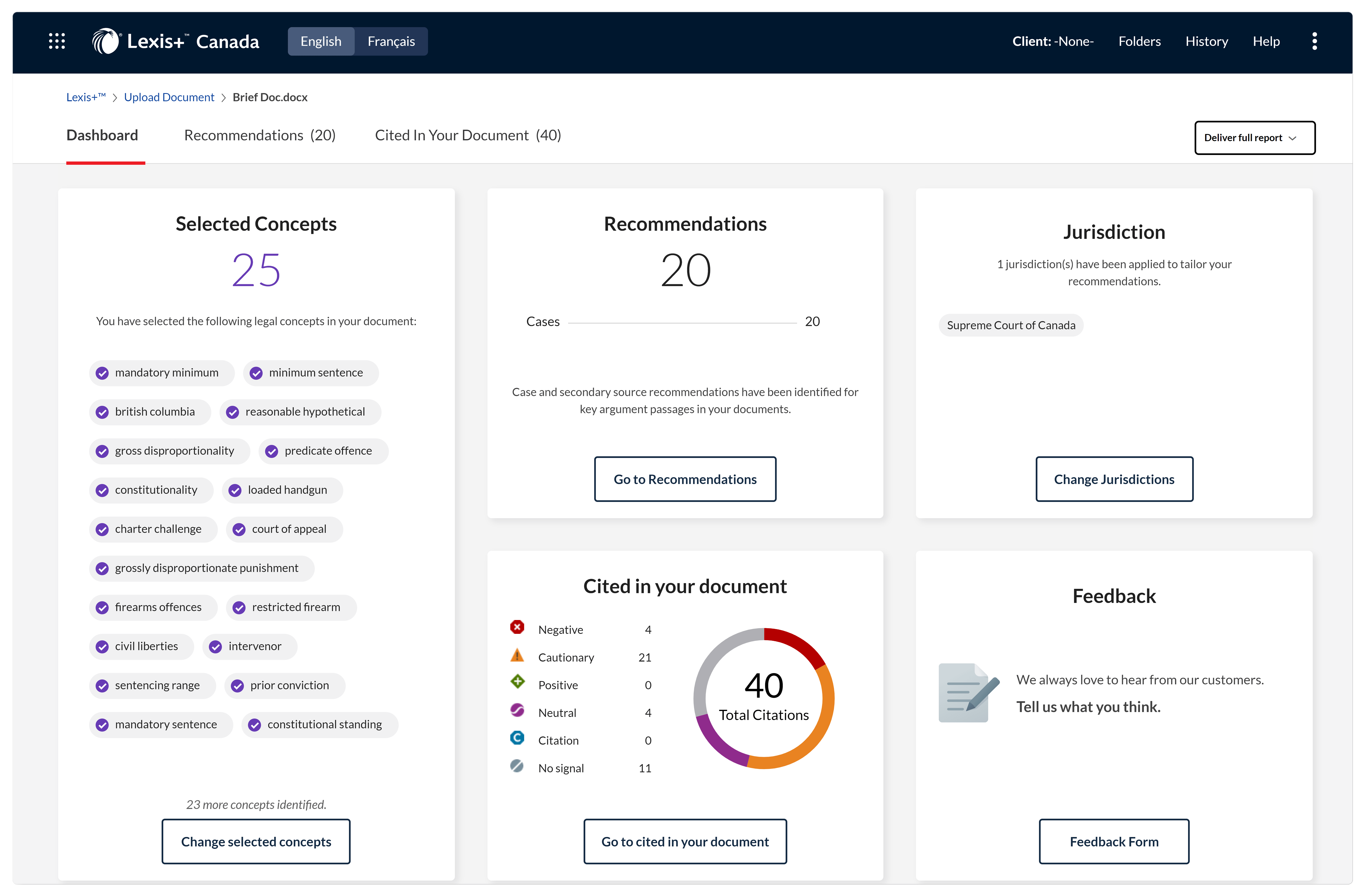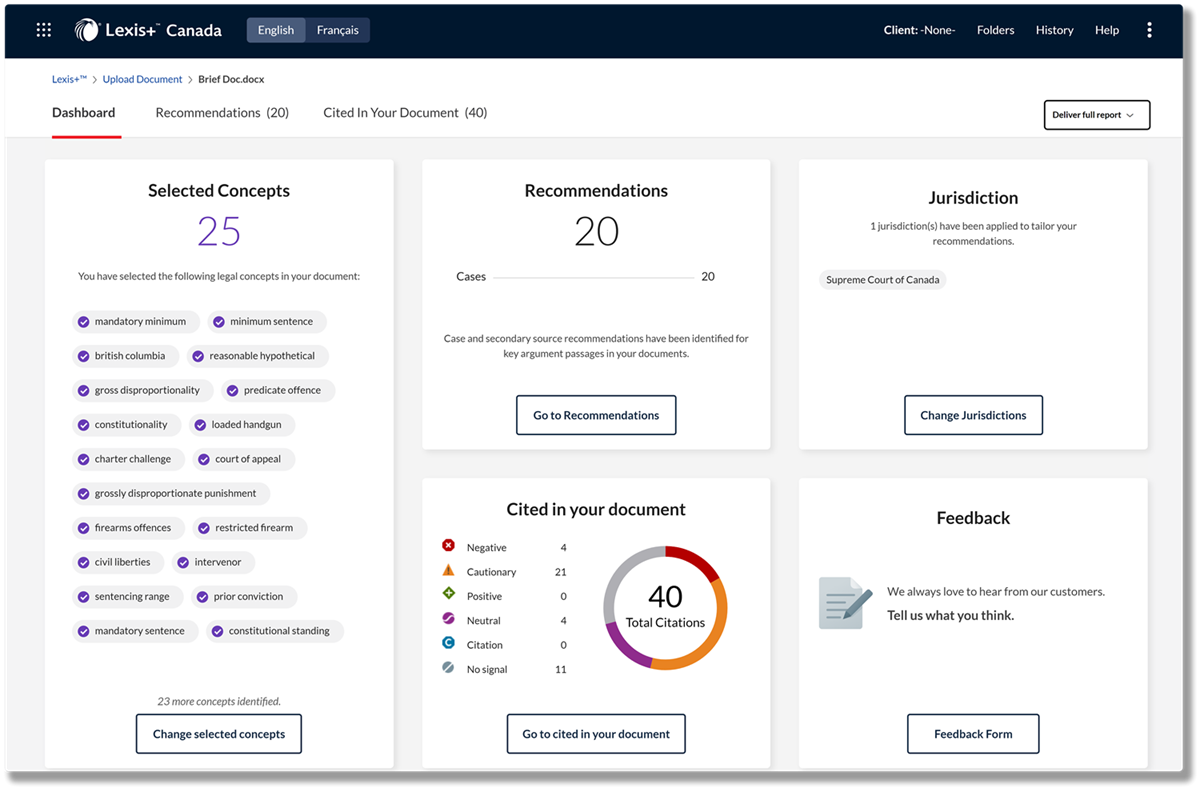 Create stronger arguments with Lexis+ Brief Analysis. Simply upload your legal document, and Brief Analysis uses artificial intelligence to instantly scan the entire document, producing a dashboard report that pinpoints legal concepts, surfaces further research recommendations, and uncovers additional language from similar cases that support your arguments.