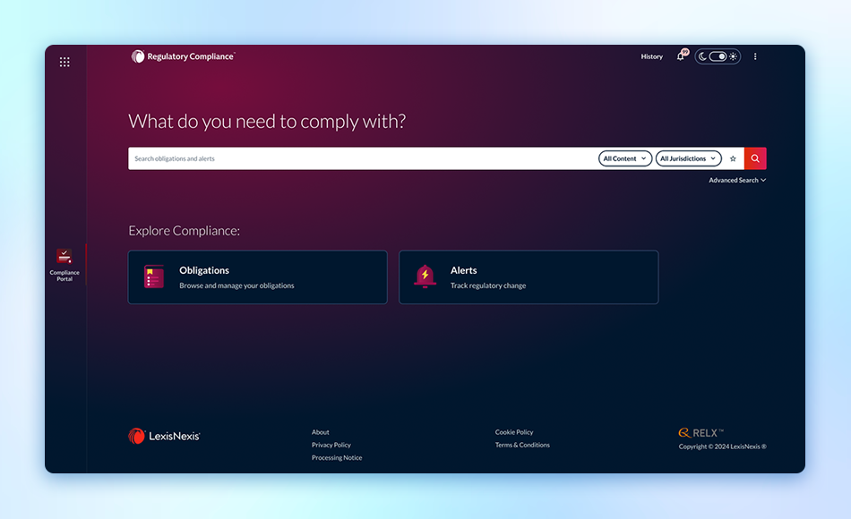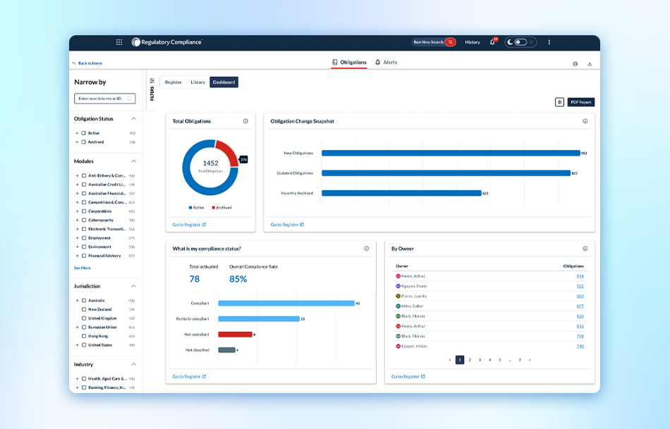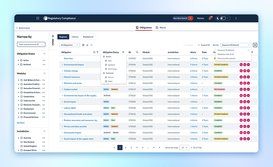 View obligation summaries and linked alerts and tools. Filter by module, jurisdiction, or status to get what you need, when you need.