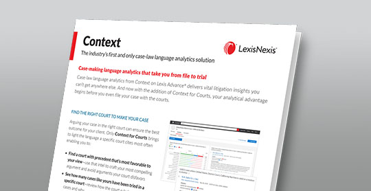 SEE MORE ON CONTEXT EXPERT ANALYTICSDiscover how many cases like yours have been tried in a specific court, how the court ruled and what language succeeded—before you even file your case.