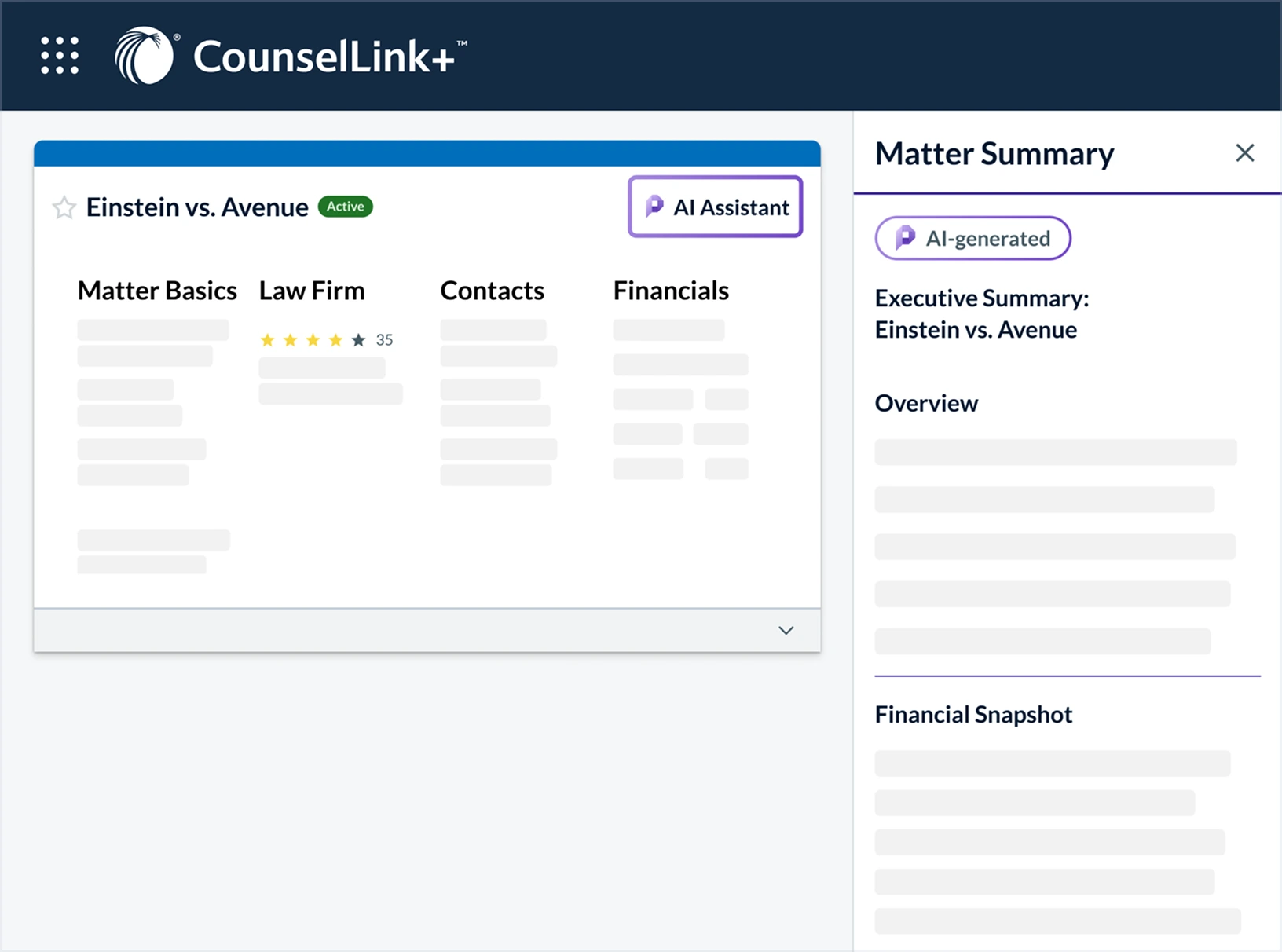 Transform your legal operations with integrated AI across your workflow: Advanced analytics that tell your data's story, contract analysis that extracts key information in minutes, and LexisNexis Protégé™ in CounselLink+ for intelligent invoice and matter summaries.