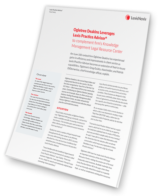 Am Law 100 ranked firm Ogletree Deakins has experienced gains in efficiency and improvements in client service as Lexis Practice Advisor becomes an extension of their in-house capabilities. Ogletree’s Greg Guidry, shareholder, and Patrick DiDomenico, chief knowledge officer, explain.