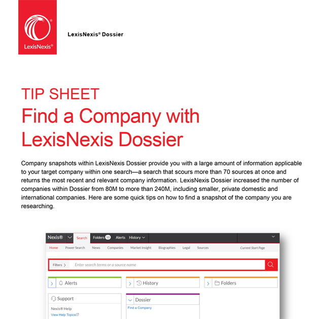 With LexisNexis Dossier, you can find comprehensive company, executive and market information. Read tips to quickly find what you need.