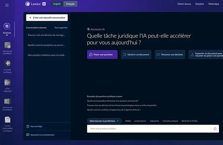 Avec ses outils de recherche conversationnelle, de rédaction, de résumé et la possibilité d’importer vos documents, Lexis+ AI stimule la productivité, améliore la qualité du travail et procure des avantages économiques aux professionnels du droit.