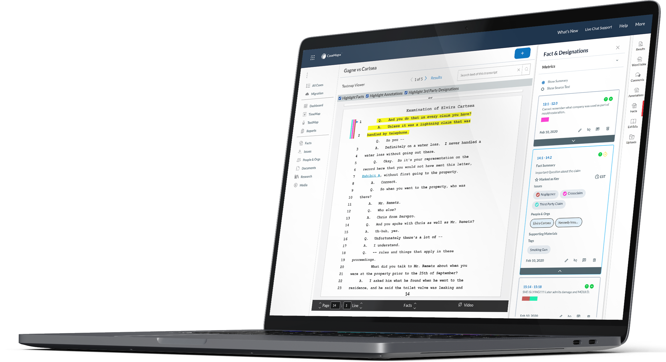 Recherchez et trouvez les informations clés des interrogatoires alors que la vidéo synchronisée suit votre cheminement, permettant une recherche de faits, une annotation et une création de rapports faciles.