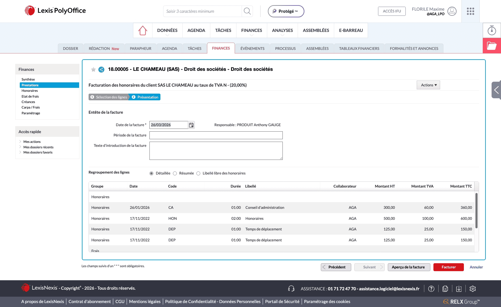 Optimisez votre facturation juridique. Lexis PolyOffice vous permet de créer, envoyer et suivre vos factures en lien direct avec vos temps passés et vos honoraires convenus