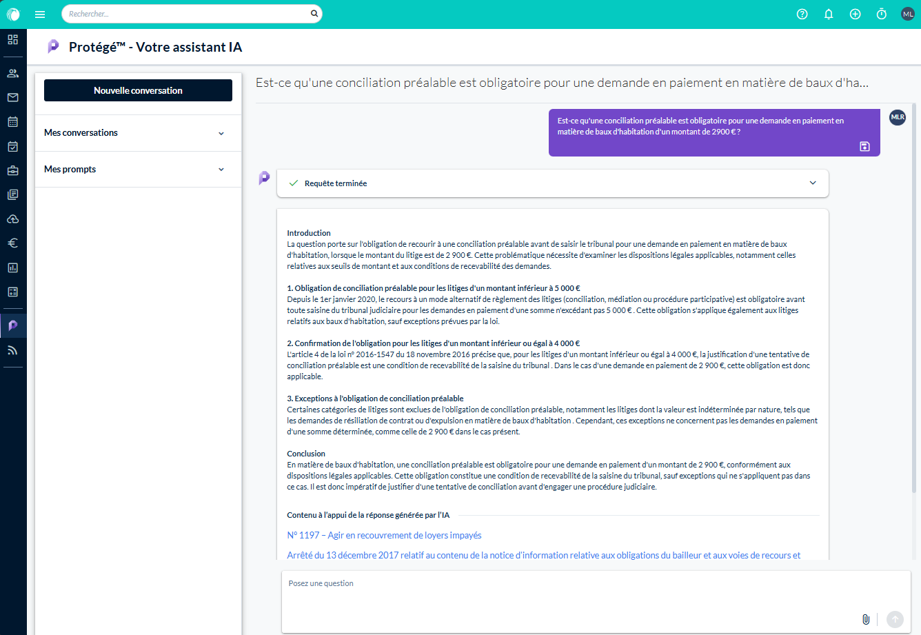 Posez votre question en langage naturel : Protégé analyse votre contexte, interroge Lexis+ et génère une réponse structurée, fiable et sourcée. En quelques secondes, vous obtenez une réponse claire fondée sur des références juridiques vérifiées.