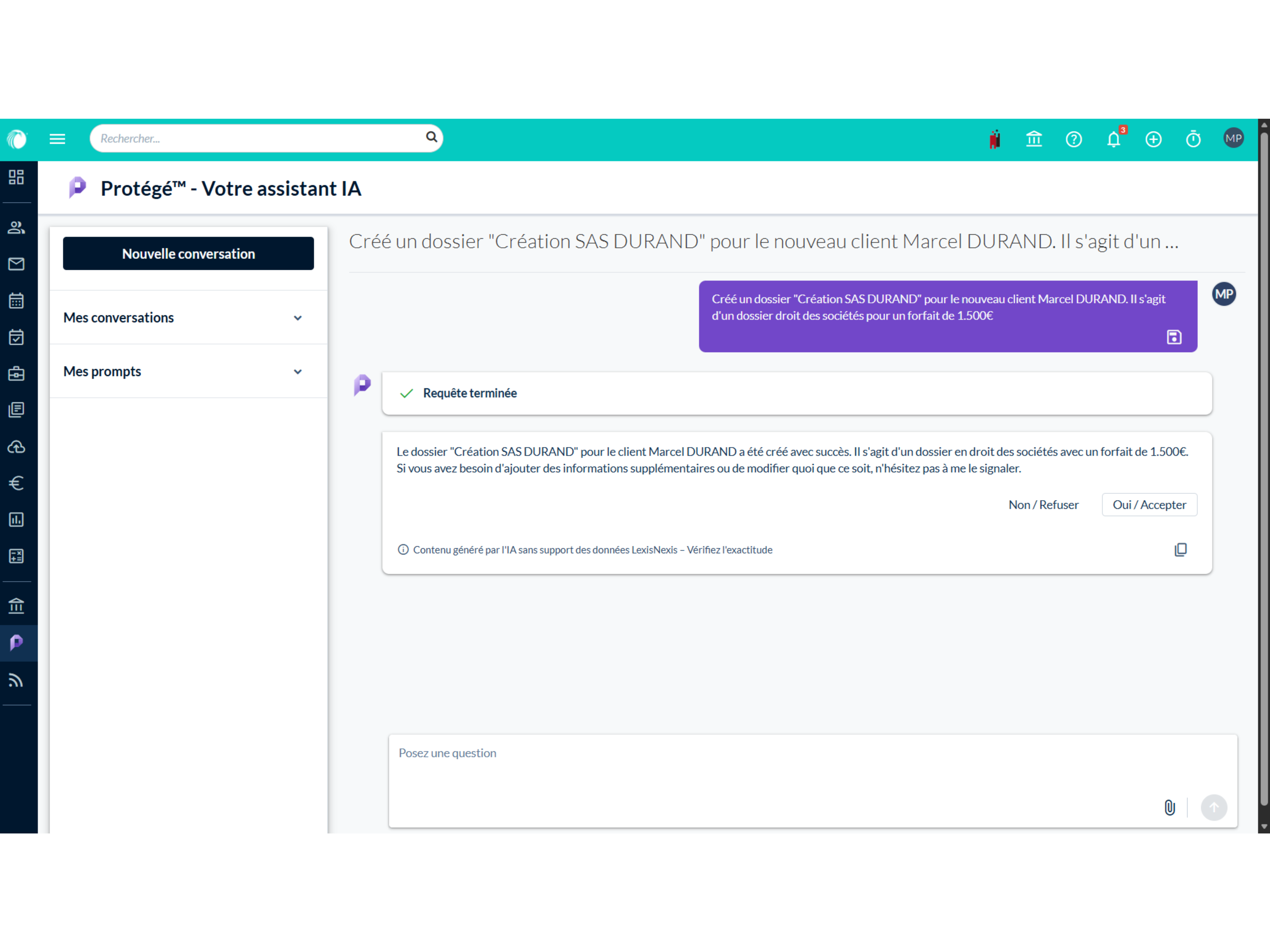 Protégé est né d’un constat simple : vous avez besoin d’un outil capable de traiter l’information plus vite, pour vous permettre de vous concentrer sur ce qui compte vraiment. Il vous accompagne au quotidien en accélérant vos recherches, en analysant vos documents et en facilitant la création de vos contacts et dossiers.