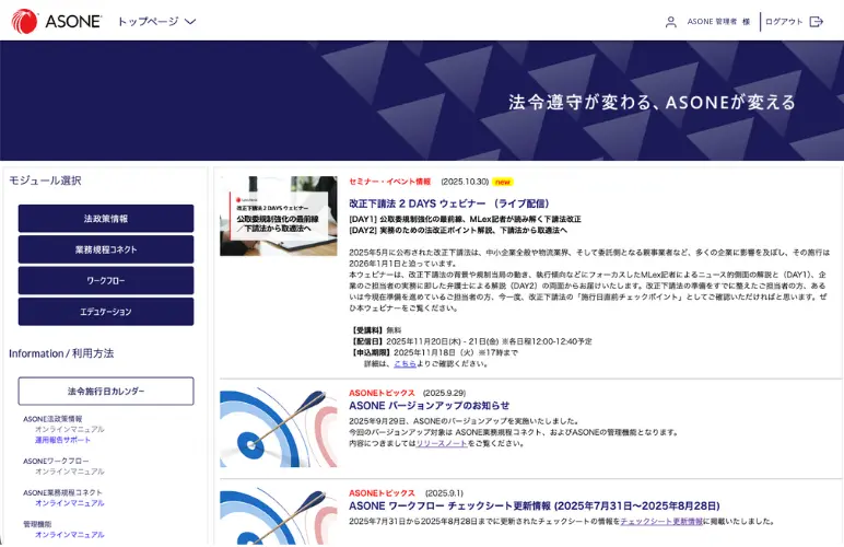 ASONE®は、法規制改正情報の効率的な収集や、コンプライアンスチェック体制の構築はもちろん、社内規程整備や法務教育など、自社のリスクマネジメントに必要なシステムが複数のモジュールで構成された企業コンプライアンス遵守のためのワンストッププラットフォームです。