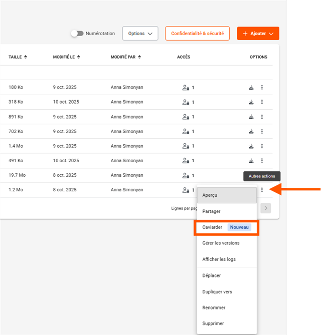 Pour démarrer, accédez au module Documents. Dans la colonne Options à droite du document, cliquez sur les trois petits points (⋮) intitulés “Autres actions”. Puis dans le menu déroulant, sélectionnez l’option encadrée “Caviarder”.