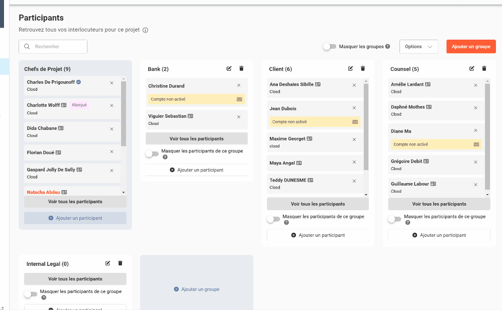 Les Chefs de Projets peuvent visualiser l’ensemble des Participants et définir le degré de confidentialité du Projet à l’aide des options Masquer les groupes et Masquer les Participants.