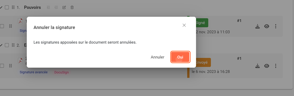 Une fois le document en statut Brouillon, vous allez pouvoir accéder aux Paramètres pour modifier le type de signature ou vos signataires et validateurs.