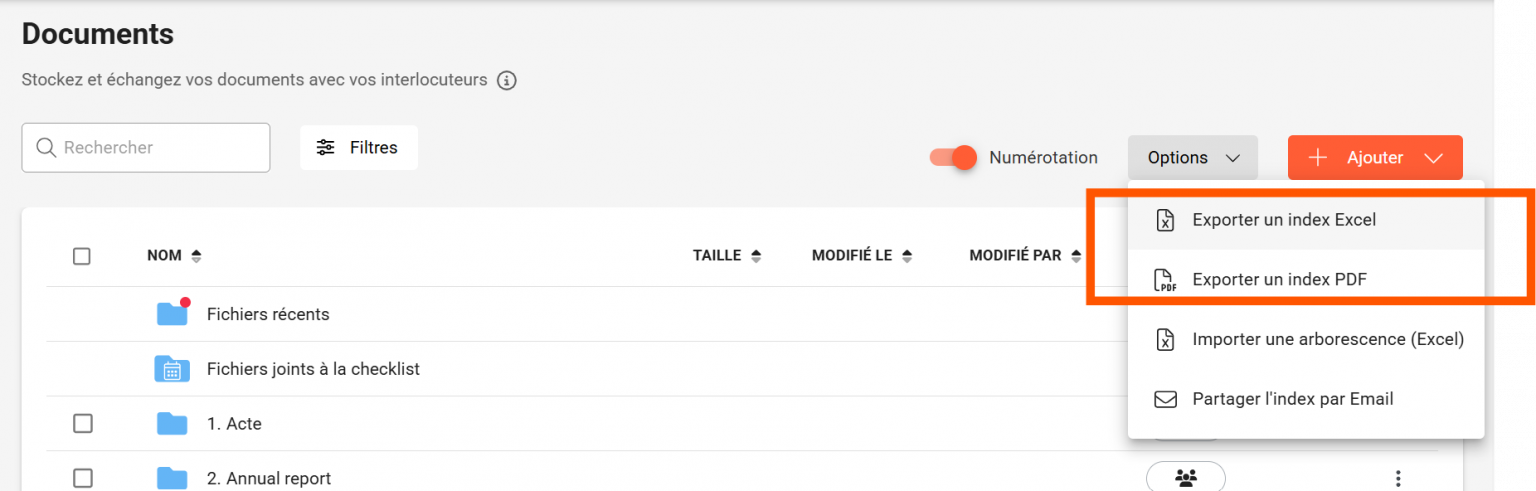 Vous pouvez générer une liste complète et horodatée des fichiers et dossiers présents dans la zone Documents, cliquez sur Options, puis le format d’index souhaité en haut à droite de la page Documents.