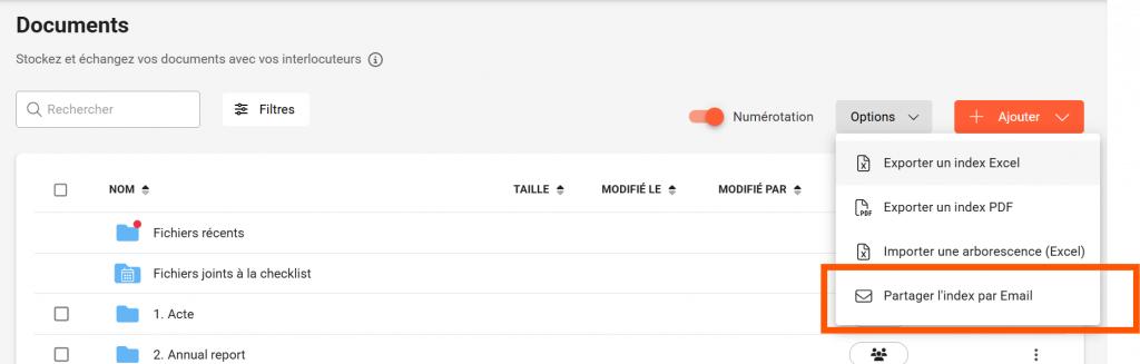 Etape 1 : Dans la zone Documents, cliquez sur Options puis Partager l’index par e-mail.