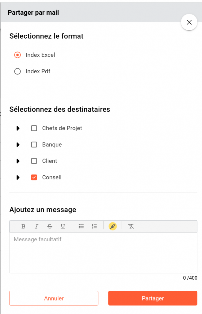 Etape 2 : Choisissez ensuite le format (Excel ou PDF) et les Participants du projet à qui vous souhaitez envoyer l’index.