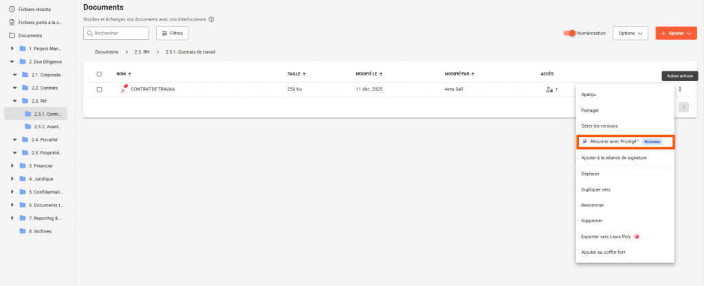 Pour résumer un document, accédez au module Documents. Dans la colonne Options à droite du document, cliquez sur les trois petits points (⋮) intitulés “Autres actions”. Puis dans le menu déroulant, sélectionnez l’option encadrée et cliquez sur Résumer avec Protégé.