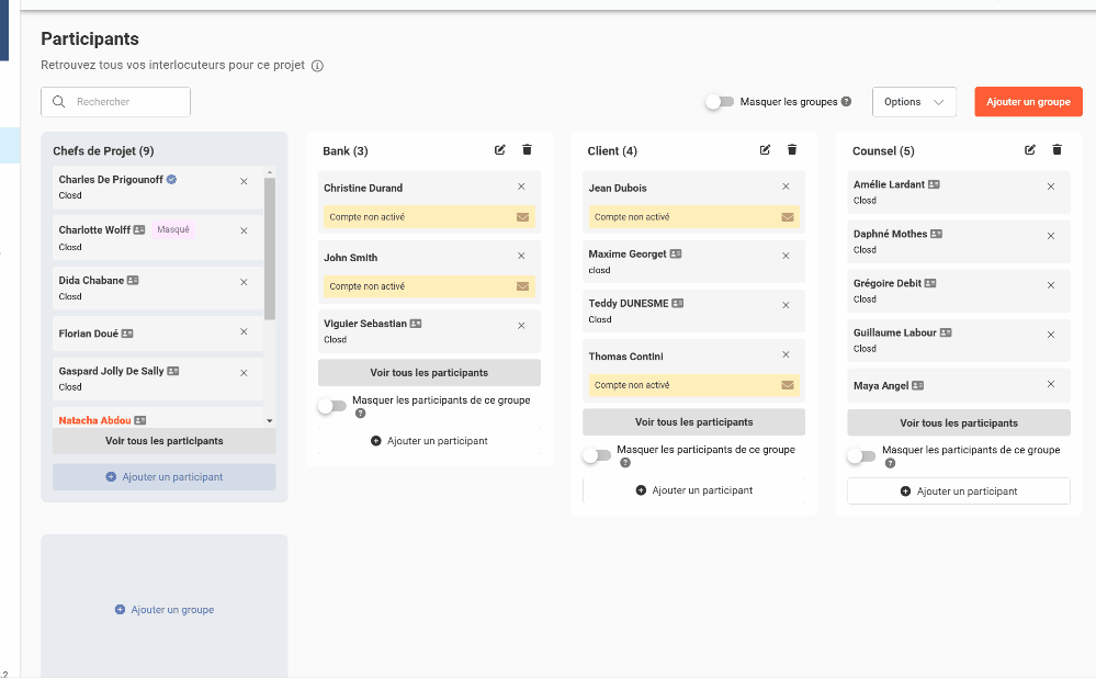 Les Chefs de Projets peuvent visualiser l’ensemble des Participants et définir le degré de confidentialité du Projet à l’aide des options Masquer les groupes et Masquer les Participants.