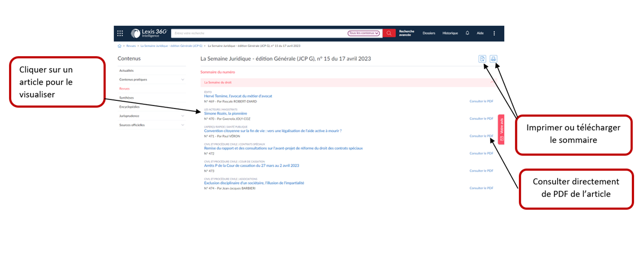 Au sein d'un article, vous pouvez accéder au sommaire de la revue ainsi qu'à la version PDF de l'article.
