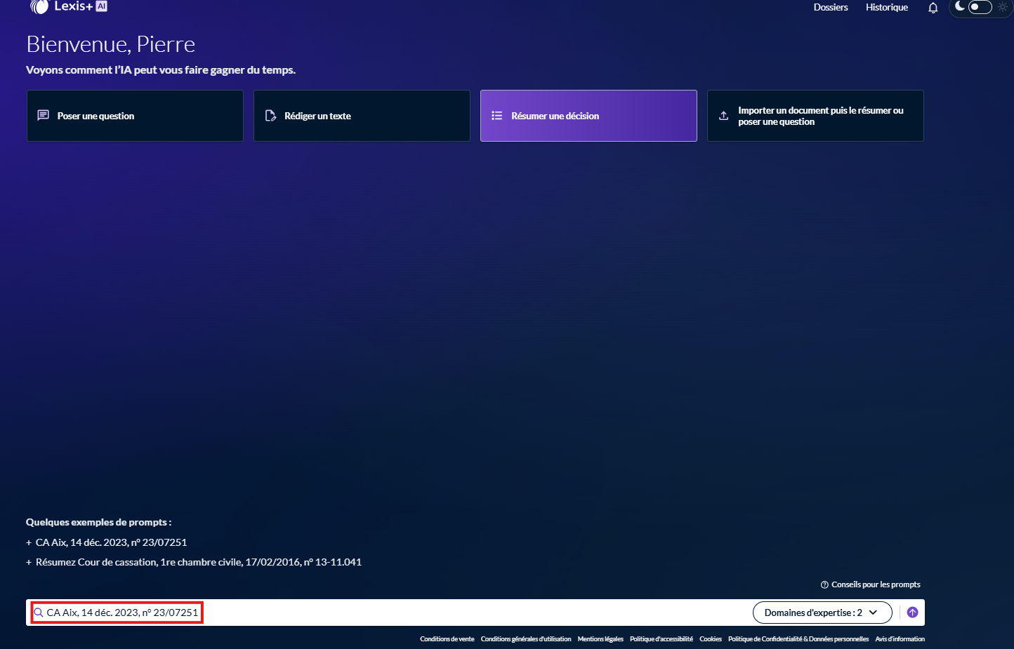 Saisissez la référence d'une jurisprudence que vous souhaitez résumer dans la barre de saisie située en bas de l'écran :