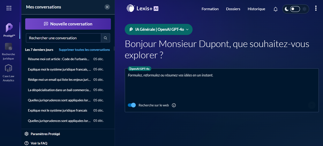 L'IA Générale Protégé est un service sécurisé qui vous permet d’utiliser des modèles de langage avancés (comme ceux de ChatGPT) au sein de l’environnement de LexisNexis.