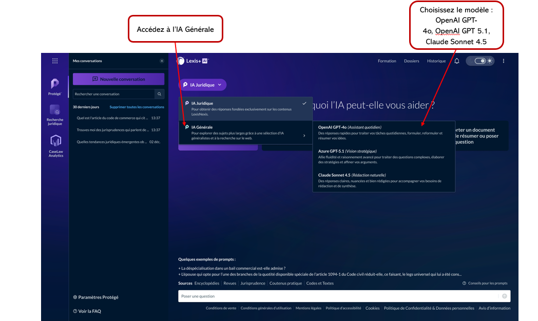 L'IA Générale Protégé est un service sécurisé qui vous permet d’utiliser des modèles de langage avancés (comme ceux de OpenAI ou Anthropic) au sein de l’environnement de LexisNexis.