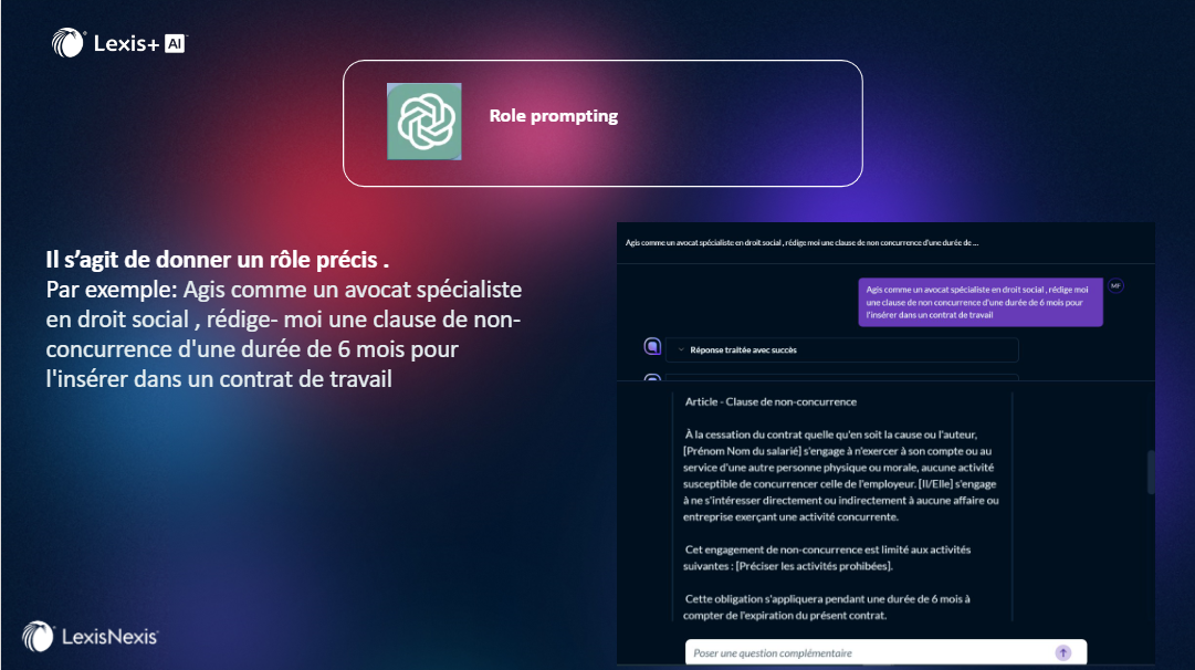 Le "Role Prompting" implique de fournir à l'Intelligence Artificielle des consignes spécifiques qui lui indiquent un rôle qu'elle doit adopter pour répondre à une question ou accomplir une tâche.