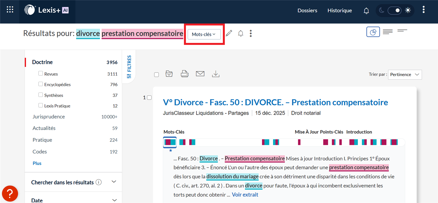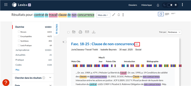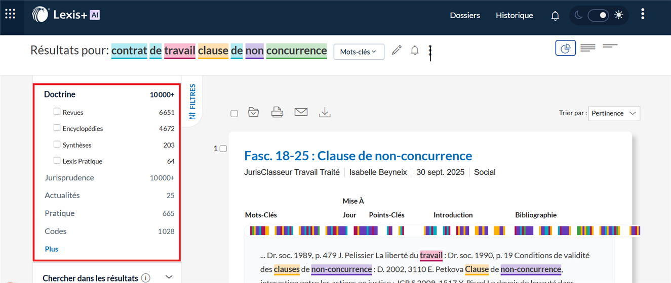 Lexis+ affiche les résultats de la recherche dans une liste contenant des informations de base sur les documents trouvés, y compris un extrait du document ou des références à l'endroit où le moteur de recherche a trouvé vos termes de recherche dans le document.