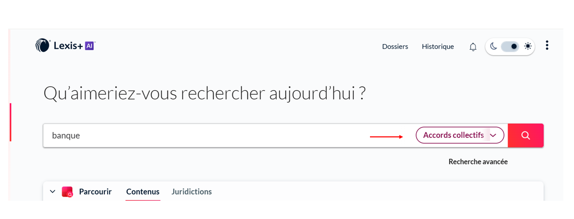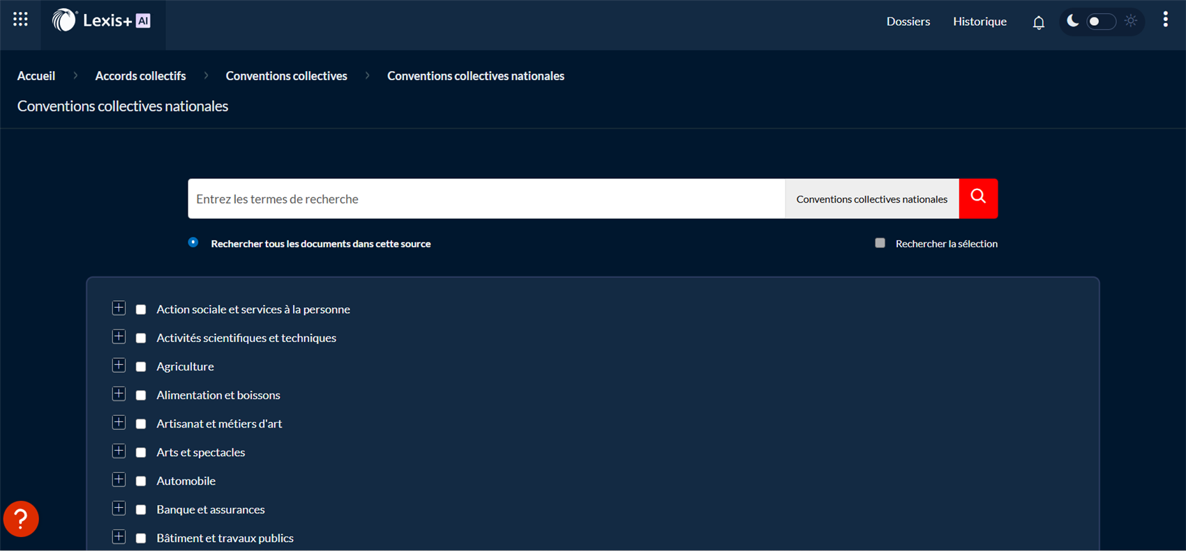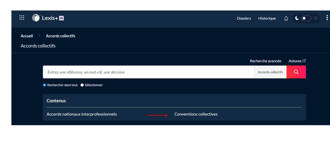 Vous avez également la possibilité de rechercher une convention collective depuis la barre de recherche Lexis+