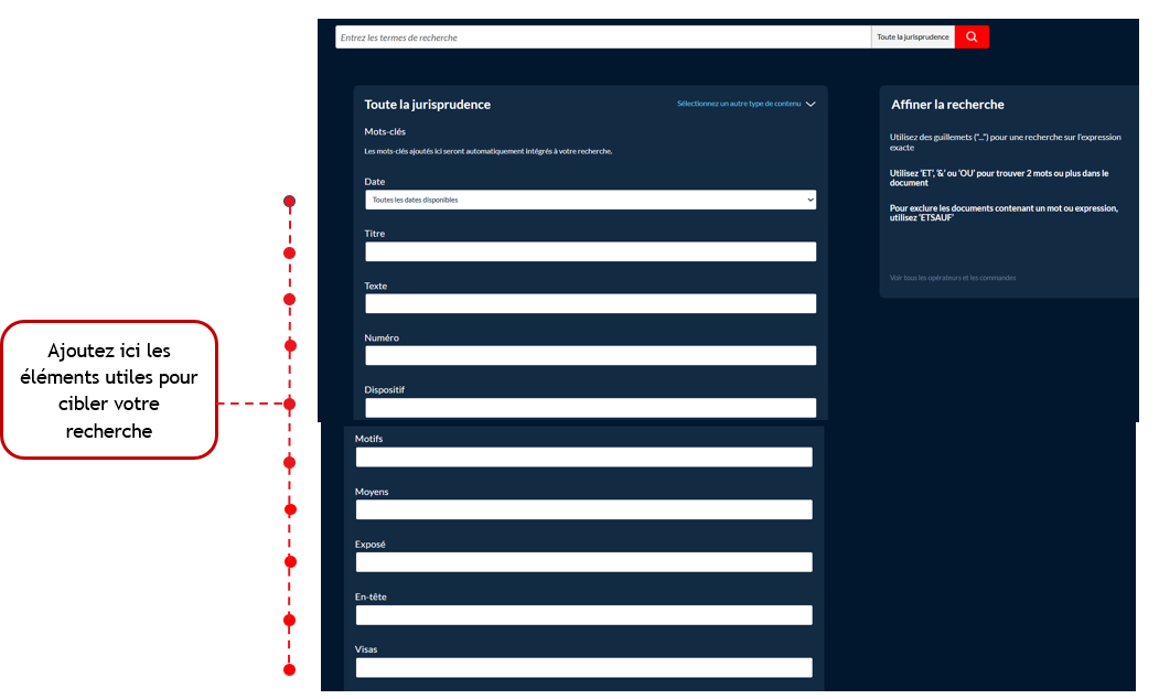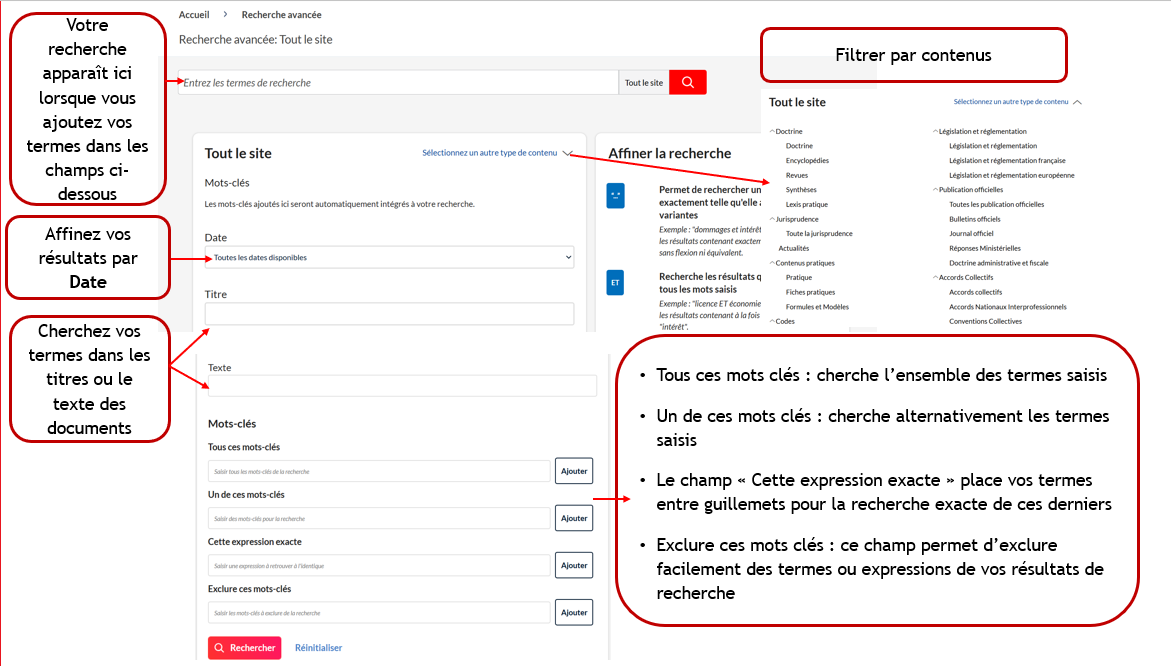 Vous pouvez utiliser des filtres avancés pour spécifier l’auteur par exemple pour une recherche dans la doctrine ou encore pour la jurisprudence les motifs ou le dispositifs, etc., garantissant ainsi des résultats très ciblés.